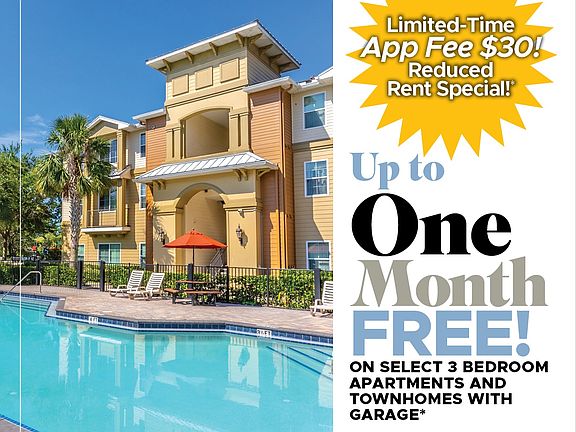 - Special offer! Up to One Month FREE on Select 3 Bedroom Apartment Homes and Townhomes with Garage!* For a Limited Time, App Fee is only $30!* *May be subject to being split over three(3) full months of residency. Must move in by 12/12/25. Restrictions apply, contact leasing office for details.
