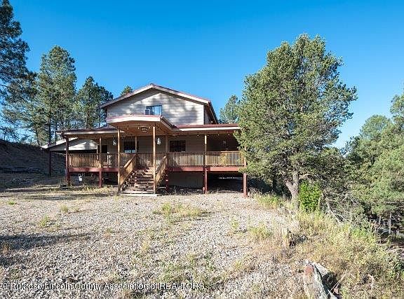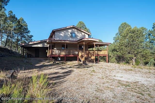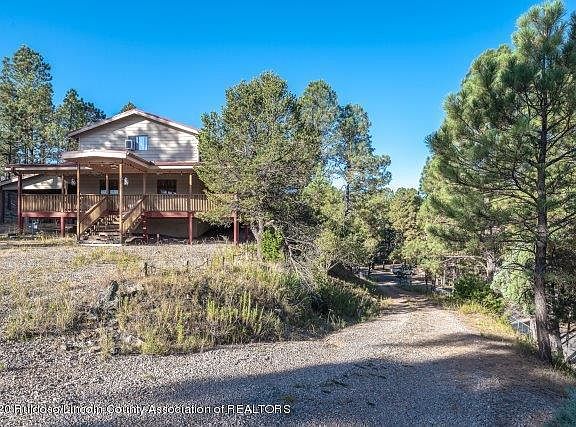 Own your own top of a mountain up on the hill! .763 ac, fenced w/panoramic , wooded/treed views! Gated entry, up on the top to level, great parking, level entry off carport to main level w/knotty pine soaring ceilings, FP, living/dining, 2 bdrms, 1 bath on main level, large master suite up w/spacious sitting area overlooking the living/dining below. New covered, wrap-around trex decks, fenced yard inside exterior chain link w/grass, underground watering system, great for your ''best friends furever''. Large lot w/ room to add on to if you want. In heart of Ruidoso yet feels secluded & private, minutes to Cree Meadows Golf Course. Come escape to the mountains!