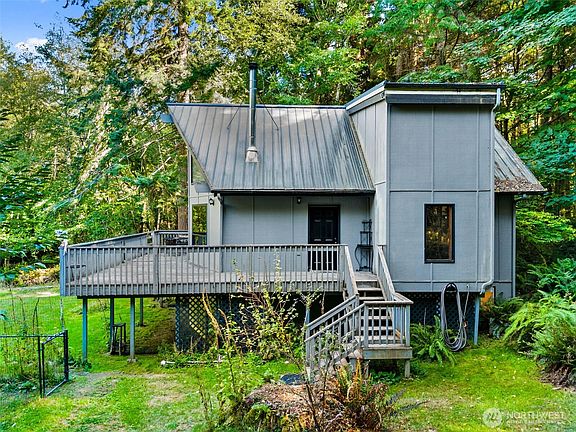 Discover this inviting Chalet style retreat nestled on just over 1.3 acres, this home combines comfort, character, and a serene woodland setting. Soaring ceilings and walls of windows fill the interiors with natural light, while the expansive wrap-around deck creates the perfect space for outdoor living and entertaining. Two detached garages provide ample storage for vehicles or hobbies. Surrounded by trees yet just minutes from the water, this property delivers both privacy and proximity to coastal living. Whether a year-round residence, weekend getaway, or investment.
