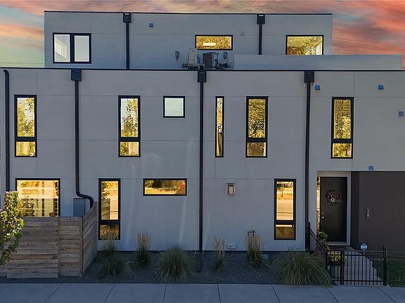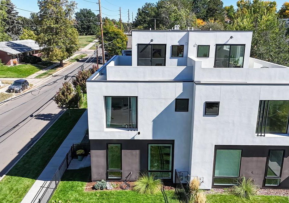 AMAZING PRICE! The perfect, like-new contemporary townhome with striking mountain views and sunsets from the private rooftop patio and retreat room with a wet bar and a secluded bedroom with murphy bed ideal for guests or use as office on the private 3rd floor! The open concept main floor plan includes a gourmet kitchen open to dining and living area with quartz composite counters, 5 burner gas stove/convection oven, pantry with pullout drawers and an over-sized island with breakfast bar and waterfall edge. Full height sliding glass door opens to wonderfully spacious private and secluded outdoor patio and backyard with built-in gas fireplace to keep you cozy on those cool nights. Patio and backyard also includes a hot tub, raised garden bed plus a playhouse and sand box for the kids and a storage shed. Second floor spacious primary suite with sitting area is a retreat from the outside world with spacious 5-piece bath complete with soaking tub and oversized frameless glass shower! There are two more bedrooms with full height glass windows overlooking front yard and served by a full bath and a convenient laundry closet in the hall. This home is conveniently located 1/2 block from Rosedale and City of Kunming parks and 2 1/2 blocks from Harvard Gulch Park with soccer fields, volleyball, neighborhood pool, 9-hole golf course, playground and walking/running paths and it is also only blocks away to multiple restaurants and shops on Old South Pearl St in Platt Park. First floor also includes a sunny office/studio in the front with full height glass that overlooks the fenced front yard. Recently painted and custom 2-way blinds (2022), carpeted (2024). Built-in wiring for high-speed internet and audio/visual. Sprinkler system in raised garden bed, front and side.