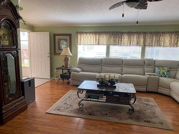 If you are looking for a home that has a driveway that 18 x 45 and has room enough for 6 cars. A 25' x 20 'garage and then a 25'x 16' workshop. 25'x 18' covered carport, 18'x45' driveway then you will want to see this beautiful home. This man cave is coming with a lot of tools so make sure you look at the pictures to get a close look of what's being left in the workshop. When you walk into the front door of this home you come into a breezeway and then into an extra-large living room and dining room. This home has a family room along with three bedrooms, and 2 bath. The master bedroom is large with 2 walks in closets and a beautiful bathroom that was redone in 2019. The master shower is tiles with two sinks and a lot of storage with an extra closet for linens and misc. items. In the master bathroom has new countertops, sinks, faucets, cabinet doors, boxes have been repainted and medicine cabinet and laminate flooring, hardware and lights have been replaced in 2019. Both guest bedrooms are large with big closets with laminated flooring put in 2019. The guest bathroom has a walk-in shower and a tub. The countertop, sink, cabinet doors, boxes that have been repainted and new hardware and lights in 2019. New roof with transferable warranty to in 2021 and along with 3 new skylights. New water heater (50 gallons) 2018. In the large kitchen you have a lot of cabinets and counter tops. New dishwasher 2021, refrigerator 2015, new counter tops in 2015 and new washer and dryer in 2021. The kitchen comes with a built in oven, smooth top stove, disposal, polar sink. This kitchen also comes with a kitchen nook that over looks the front of the home. The home has a very large lanai 14'x 25' raised screen with vinyl windows and entrance from the outside so friends can come into the lanai without going through you home. The home has sprinkler system, fed from the lake (free). This home sits on a lot and half with fruit trees and a beautiful landscape yard. The home has 2010 sq. ft. of living space inside the home and that's not counting the lanai. This home comes totally turn-key so all you need to bring is your clothes and toothbrush and you can start living in the Florida lifestyles. The lot rent on this home is $912.25/mo. and includes mowing, edging, trimming, High Speed Internet, 2 HD boxes and 200 cable channels. Outside the clubhouse includes Olympic size swimming pool, hot tub, outdoor kitchen, fire pit. Inside the club house you get an exercise room, billiard room with 3 pool tables, card room, library, tv room, huge ball room with an industry size kitchen, a craft room where they have a kilt for firing ceramics. Some of the activities at The Gardens are shuffleboard, horseshoes, darts, card games, mah jogg, dance once a month with a live band, ping pong, tennis courts are some of the few things that you can do. All listing information is deemed reliable but not guaranteed and should be independently verified through personal inspection by appropriate professionals. Integrity Mobile Home Sales cannot guarantee or warrant the accuracy of this information, measurements or condition of any property. Measurements are approximate. Lot rent subject to change.