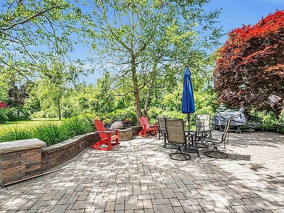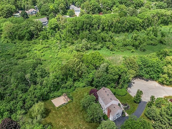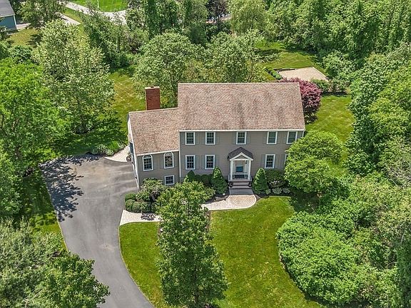 Tranquility at home! Beautifully cared-for 4-bdrm, 2.5 bath colonial w great curb appeal, stone walls, flowering trees. 3-acre lot wraps cul-de-sac w giant yard, trees for privacy, lovely landscaping, generous buffer at end of road. Huge patio w stone-wall integrated firepit, mature plantings and garden area create welcoming setting. 2-car garage, hdwd flooring, central AC, crown molding, big rooms, generous light. Oversized foyer leads to lg living rm w area for game night/workspace. Eat-in kitchen w granite, stainless, tile next to lg dining rm perfect for entertaining a good-size group. Great room is a fabulous space w cathedral ceiling, fireplace, built-in bookcases, sizeable windows and ample space to gather. Upstairs 4 bdrms inc primary suite w cathedral ceilings creating bright, airy space w walk-in closet, ¾ bath. Roomy landing leads to full bath and 3 more bdrms. Need more space? 800+sqft bonus finished in basement: playroom, office? This is a splendid place to call home.