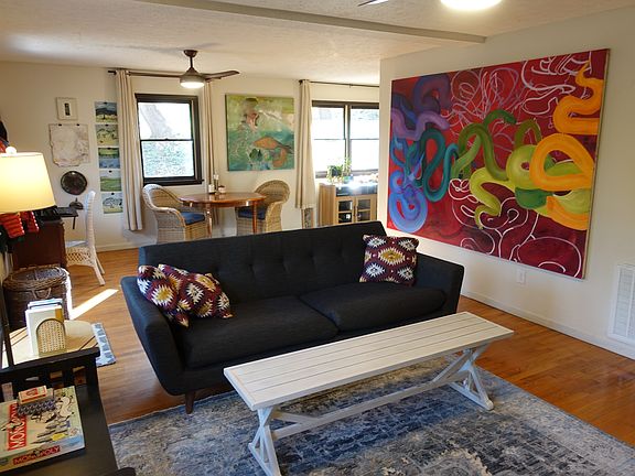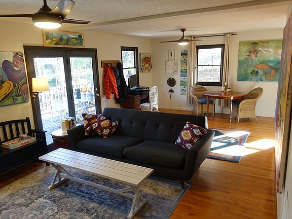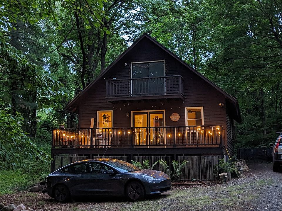 Sweet A-frame cottage on a wooded lot, just five minutes from downtown Morganton. This two-bedroom home features two newly renovated full bathrooms, thoughtful furnishings, and an inviting layout. Enjoy morning coffee on the porch and cozy fires on the patio in the evening. The home includes an in-unit washer and dryer, plenty of parking, and a quiet neighborhood with easy walkable access to downtown.