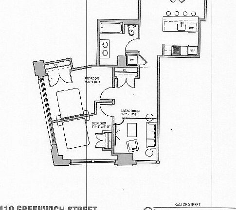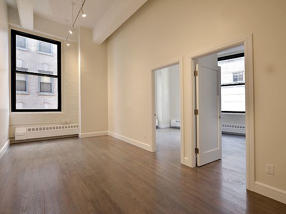 Luxuriously renovated sprawling corner two bedrooms converted into three bedrooms with condo level finishes. This modern, elegant residence features soaring 14' ceilings, oversized windows with amazing light and views from both north and east. The state of the art renovations include a gorgeous chef's kitchen with seating for 4 at the Caesarstone waterfall counters. Top of the line stainless steel appliances by Bertazzoni, a Blomberg refrigerator, Whirlpool microwave with fan and dishwasher. Gorgeous oak floors throughout with a weathered gray finish accentuate this chic space. The spa like porcelain bathroom has a double sink vanity and Kohler suite of fixtures. There is built in ceiling track and recessed LED lighting, storage and closet space. There is a Bosch washer/dryer in unit. 110 Greenwich Street is a loft doorman elevator building with on-site laundry facilities, gym and beautiful common roof deck. The building is located in the in the heart of the Financial District near World Trade Center and Brookfield Place, just 1 block north of Rector St. and 2 blocks from Battery Park City. 110 Greenwich Street greatly benefits from its close proximity to multiple transportation options. The Fulton Center transportation hub provides access to 10 subway lines including the 2, 3, 4, 5, A, C, E, J, Z, and R trains.