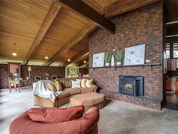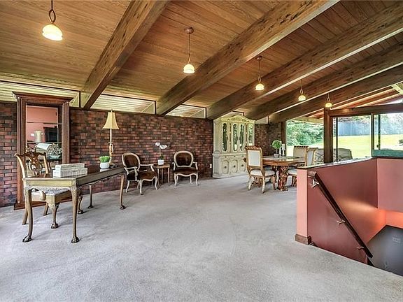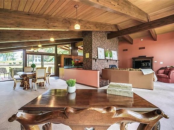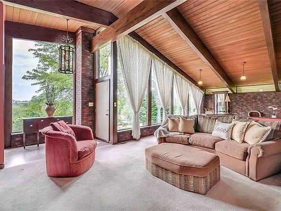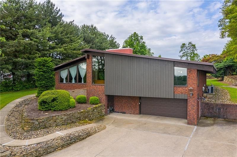Mid-Century Modern ranch home that offers impressive architectural lines and a flexible floor plan, situated on almost 3 park like acres in the desirable Nyetimber Community.High wood ceilings with exposed beams are complemented by floor to ceiling windows all around to become one with nature and loads of natural light. The expansive brick fireplace grounds the living and dining room to the open kitchen that manages to fit the style with a brick accent wall, SS/black appliances with ceramic tile floors, 3 spacious bedrooms, master bedroom and bath. Unique concrete floor construction, new roof, finished lower level with a full bath and a wood burning fireplace. Covered patio overlooks the private park like yard, separate storage building and access and room to build a large garage for all your toys accessible from Beaver Grade Road. Conveniently located near The Mall at Robinson, Moon Schools, parks, Montour Trails, minutes to Downtown Pittsburgh and The Pittsburgh Airport.