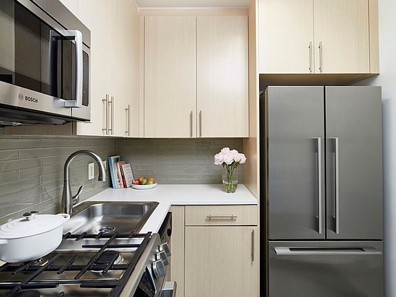 No Fee! Available Now! Large, light-filled, renovated alcove studio with great closet space and a separate kitchen. Kitchen renovations include stainless steel Bosch appliances and quartz countertops. Gorgeous bathroom finishes featuring marble tiles and a rain shower head. Sunny Northern Exposure with two windows! Amenities in the building include a large landscaped roof top terrace, fitness center, laundry room on-site, and a 24-hour concierge.