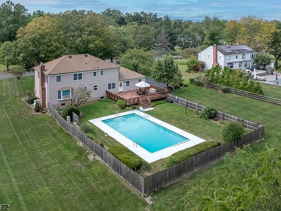 Set on nearly an acre in one of Basking Ridge's most desirable neighborhoods, this true 5-bedroom Colonial offers generous space, timeless style, and a setting of uncommon tranquility. The first floor includes a private office, a sunlit living room, a well-sized dining room, and a large kitchen with breakfast area. A wood-burning fireplace anchors the spacious family room, creating a welcoming place to gather. Upstairs, five bedrooms provide versatility for all lifestyles. Outdoors, a large deck overlooks the pool and a private wooded backdrop to enjoy. The setting is one of its greatest treasures peaceful and tucked away with no train or highway noise, yet only minutes from the town center, shopping, restaurants, transportation and top rated Basking Ridge schools. With its scale, character, and location, this home captures the rare balance of neighborhood living and a retreat-like atmosphere.