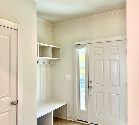 Step inside to find a bright, open floor plan connecting the living room and kitchen. A welcoming entry hall features built-in cubbies and coat hooks, creating the perfect drop zone, and a nearby pocket-door half bath adds convenience for guests. The gourmet kitchen offers stainless steel appliances, solid-surface countertops, an expansive island ideal for bar seating, and a striking blue tile backsplash that adds a subtle nod to Carolina blue. Ample cabinetry and a walk-in pantry provide generous storage and functionality.