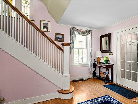 Nestled in Buffalo’s sought-after Central Park neighborhood, this beautifully maintained 3-bedroom, 1.5-bath home is a rare find—offering charm, character, and modern updates amidst lush gardens. Step into a welcoming entryway featuring a coat closet, access to a convenient half bath, and a French door leading to the gracious living room. The living space boasts oak hardwood floors, a gas fireplace (NRTC) with a classic mantle, and an open staircase highlighted by a stunning stained-glass Palladian window at the landing. The formal dining room exudes elegance with crown molding, a beautiful fireplace (NRTC) with marble surround, and a crystal chandelier with ceiling medallion. The updated eat-in kitchen showcases granite countertops with undermount sink, tile backsplash, stainless steel appliances, recessed lighting, and a pantry for ample storage. Off the kitchen, enjoy year-round serenity in the bright three-season room featuring skylights, sliding glass doors, and a cozy wood-burning stove—perfect for morning coffee or evening relaxation. Upstairs, the primary bedroom offers hardwood floors and a spacious dressing area. Two additional bedrooms overlook the beautifully manicured backyard. The full bath includes a tile floor, glass vessel sink, and a tub/shower combo with subway tile surround. Additional highlights include a walk-up attic with finishing potential, newer replacement windows throughout most of the home, a newer hot water tank (2017), high-efficiency furnace (2018) with central air (2018), updated electrical service (2016), 15-year-old roof, and a detached 2-car garage with second-floor storage (2008). Enjoy outdoor living in the private, partially fenced, park-like yard with flower gardens, water features, and a charming, covered pergola. This home blends classic architecture with thoughtful updates—truly a must-see!
