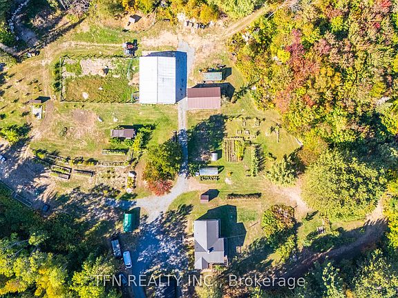 Discover a tranquil retreat on 25 acres of picturesque woodlands, complete with a spring creek, nestled in a private setting. This modern rural residence is conveniently located just 20 minutes from Burk's Falls or Sprucedale, with public boat launches only a 10-minute drive away.This incredible property boasts two detached car garages and a spacious 20x50 barn featuring eight stalls, a 20x36 shop, a chicken house, 8x8 a new shed and ,greenhouse 10x20. Enjoy the fruits of your labor with thriving apple, pear, raspberry, blueberry, and cherry trees, along with a flourishing asparagus patch.The home offers a perfect blend of modern and rustic design, featuring an open-concept living area that seamlessly integrates the kitchen, dining, and great room. A cozy gas fireplace adds warmth and ambiance, making it an inviting space for gatherings. The kitchen is equipped with ample cabinetry and counter space, along with a stove and cooktops for all your culinary needs.The walkout basement includes large patio doors, providing easy access to the outdoors. This level also features a separate laundry room, storage area, Murphy bed and an additional 4 bedrooms currently using as cold room and dry room. complemented by a second wood stove. Two rooms in the basement have been converted into a dry room and an extra insulated cold room, adding functionality and convenience. Wildlife abounds on this stunning property, making it an ideal sanctuary for nature lovers.Dont miss the chance to create your own rural paradise.
