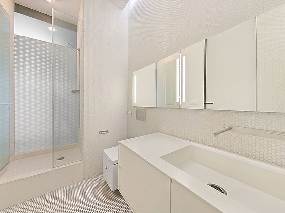 As you enter the spa-like bath you will find a sculptural deep soaking tub and a very sizeable tall walk-in glass enclosed shower with multiple sprayers for relaxation. The long vanity has double sinks and excellent storage.