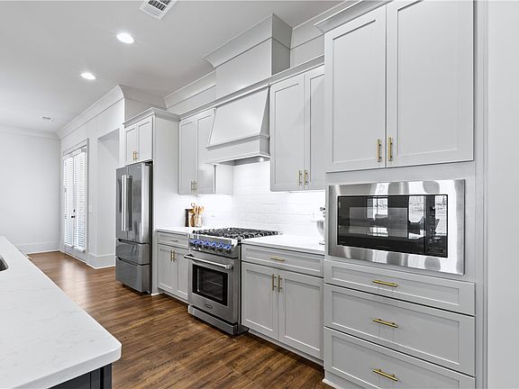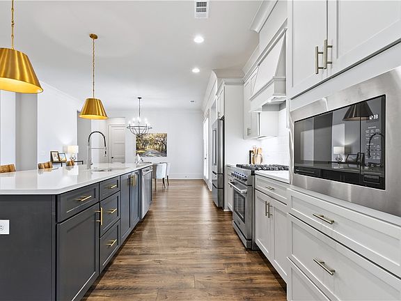 The gourmet kitchen is a true centerpiece w/quartz countertops, two-tone cabinetry, upgraded Cosmo appliances (incl 5-burner stove & convection oven), bar seating for four, a butler’s pantry (adj walk-in pantry) and coffee bar. All accentuated by recessed lights, stylish island shades & must-have under cabinet lighting. Tucked politely across is a versatile formal dining or den space - the choice is yours! A private foyer-entry introduces the owner’s suite, thoughtfully proportioned to accommodate your furnishings with ease. The ensuite impresses w/dual quartz vanities, a frameless glass shower (three shower heads), distinctive floor-to-ceiling tile, a free-standing soaking tub, abundant natural light, and an expansive closet. Two bedrooms share a Jack & Jill; the fourth w/private bath is an ideal guest suite. Guest half bath nearby too!