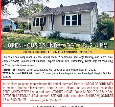 ABSOLUTE AUCTION! This is a LIVE ON-SITE Auction! THURSDAY October 16th at 5:30 p.m. This home has living room, kitchen, dining room, 2 bedrooms, and large laundry/mud room. Nice carpeted floors. Replacement windows. Carport. Central H/A. Outbuilding. Great large lot!. Move in ready! Terms – 15% deposit day of sale, balance with deed on or before Nov. 14, 2025. Taxes – prorated. Possession – with deed. 10 day opportunity to inpsect for lead based paint begins 10/3/25. Need to spend money before the end of the year? Here is a GREAT OPPORTUNITY to make a fantastic investment! Home is neat, clean, and you can start collecting RENT IMMEDIATELY! Also a real great STARTER HOME! Come CHECK IT OUT at Open House SUNDAY, OCTOBER 12 FROM 2-4 PM and we’ll SEE YOU at the countdown THURSDAY, OCTOBER 16 at 5:30 PM!!!!