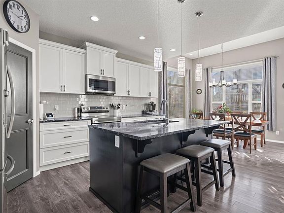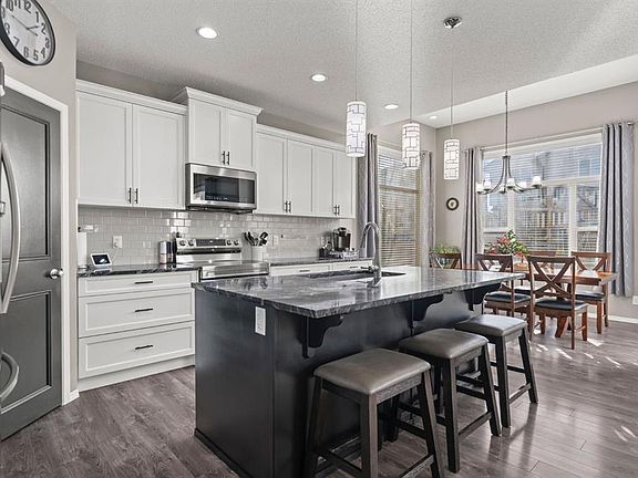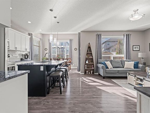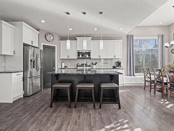 Welcome to this beautifully maintained 2-storey home in the highly sought-after community of New Brighton, offering over 3,090 sq ft of developed living space with 4 bedrooms, 3.5 bathrooms, a main-floor office, upper bonus room, and a fully finished basement. Thoughtfully designed with family living in mind, this home blends open-concept function with warm and inviting finishes throughout. The bright main floor features large windows and a spacious living room centered around a cozy gas fireplace. The well-appointed kitchen includes quartz countertops, a large island with seating, stainless steel appliances, subway tile backsplash, and a walk-in pantry, making it the perfect space for everyday cooking or entertaining. The dining area comfortably accommodates family gatherings and opens directly to the backyard for seamless indoor-outdoor living. Completing the main level is a private office with French doors, a 2-piece bathroom, and a mudroom off the garage that keeps busy routines organized. Upstairs, you’ll find a large bonus room ideal for movie nights or a play space, along with three generously sized bedrooms, including a spacious primary suite with a walk-in closet and 4-piece ensuite featuring a soaker tub and separate shower. The upper level also includes a full bathroom and a convenient laundry room with cabinetry. The fully developed basement expands your living space with a large recreation room, a beautiful wet bar with quartz counters, glass-front cabinets, sink, and beverage cooler, a fourth bedroom, and a stylish 3-piece bathroom with oversized tiled shower perfect for guests or teens. Outside, enjoy a large stamped concrete patio, built-in fire pit, play structure, and storage shed, all within a fully fenced and landscaped backyard ideal for outdoor entertaining and family fun. Located close to parks, pathways, schools, and the New Brighton Residents Association amenities, plus easy access to shopping, dining, South Health Campus, Deerfoot and Stoney Trail. The perfect place to call home!