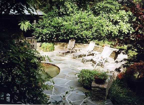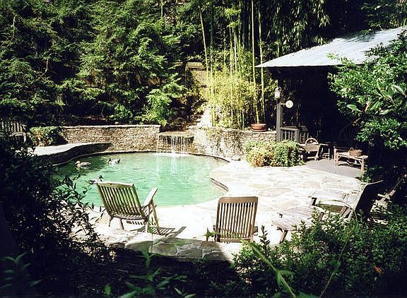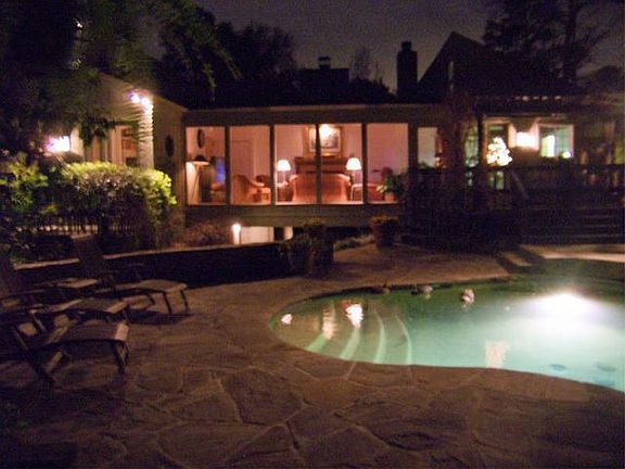 Adjacent to The Duck Pond Park, "The Bridge House", a private urban oasis, features an au pair/teen suite or a home office with a seperate outside entrance including a private driveway for parking, an indoor/outdoor elevator, a generator, vaulted ceilings, hardwoods, two rocking chair porches, decks, three fireplaces, two laundry rooms, goldfish pond with a tranquil waterfall, a Zen inspired stacked stone accented pool with a cascading waterfall, a poolside cabana for entertaining, new stainless steel kitchen appliances, a new HVAC system