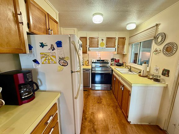 Welcome to Mid Florida Lakes, a friendly 55+ gated community offering the perfect Florida lifestyle! This spacious 2-bedroom, 2-bathroom home provides comfort and convenience with an open floor plan, a bright kitchen, dining room with built in hutch, cozy living area and and a Florida room in the front of the home with jalousie windows to enjoy the breeze in the cooler months. New windows throughout the main areas of the home with UV protection and rated to withstand hurricane winds. The primary suite includes a walk in closet as well as its own private en suite bathroom. The second bedroom is ideal for guests or a hobby room. There is a built in desk in the second bedroom ideal for use as an office. The home has been re-plumbed, electrical panel replaced, new water heater, newer dishwasher, stove, and dryer. A/C unit has been serviced every six months. An irrigation system with Rain Bird sensor has been installed so you never over water! Metal roof was re-sealed last year. The screened in side porch has a separate bar area for perfect for entertaining, laundry room, and a handy workshop/storage area. This home sits near a canal. Mid Florida Lakes is known for its beautiful chain of lakes, canal access, and resort-style amenities including two swimming pools, a fitness center, pickleball and tennis courts, a dog park, clubhouse, and endless social activities. Whether you enjoy boating, fishing, or just relaxing with friends, this community has it all!