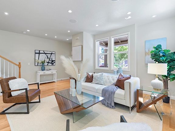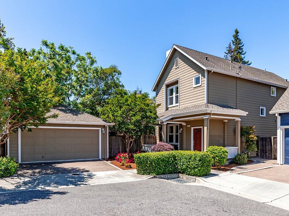 Well maintained 4 bedroom, 3 bath home on a private cul-de-sac near downtown Mountain View. Contemporary & flexible floor plan w/ bedroom & full bath on first floor. Large living room w/ high ceiling & custom fireplace. Sep dining area w/ French doors to a landscaped side yard. Updated kitchen w/granite counters, stainless steel appliances, custom pendant lights & breakfast bar that opens to a separate family / sitting w/ glass doors to a sunny backyard & paver patio. Dramatic primary suite features vaulted ceiling, large walk-in closet w/ custom organizers. Primary bath w/granite counters & dual sinks & a shower over a jetted tub. Generous sized 3rd & 4th bedroom w/ ample closet space. Full size washer/dryer on 2nd floor. Hall bathroom features double vanities w/ granite counters & custom mirrors. Newer shower over tub w/custom tile surround & flooring. Hardwood floors, plush carpeting + recessed lighting throughout. Private landscaped wrap around backyard and spacious 2 car garage.