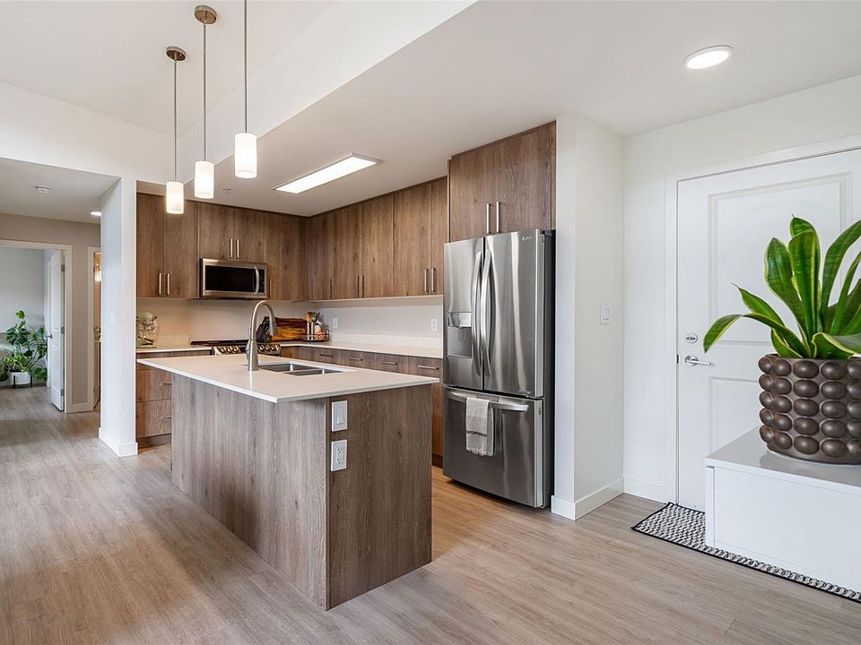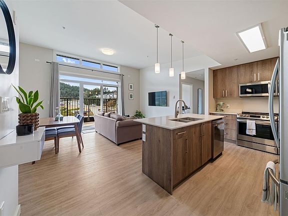 Top-floor west-facing 2 bed + den, 2 bath condo at Thetis Lakeside! Offering 1,055 sq. ft. of bright living space, this home features soaring 9’ vaulted ceilings that go up to over 11' with extra windows for natural light, plus an oversized deck with views to the Olympic Mountains. The open concept layout includes a modern kitchen with quartz countertops & stainless appliances, flowing to a spacious living/dining area. The primary bedroom boasts a large walk-in closet & space for an office/reading nook, while the 2nd bedroom also has a generous walk-in closet. European vinyl plank flooring adds style throughout. Extras include 2 storage lockers & 1 parking stall. Pet-friendly with large dogs allowed (no weight restrictions)! Building offers 2 elevators, dog area, bike storage, e-car spaces & ample visitor parking. Steps to Thetis Lake Park & the Galloping Goose, and minutes to shopping, dining & recreation. Rentals allowed!