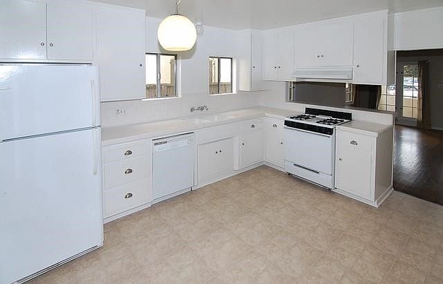 * Bright open kitchen with white tile countertops & backsplash, white cabinetry with new chrome pulls, white finished appliances including as-is refrigerator, two compartment sink, built in storage & pantry closet, custom lights and breakfast bar. Back door to covered patio area.