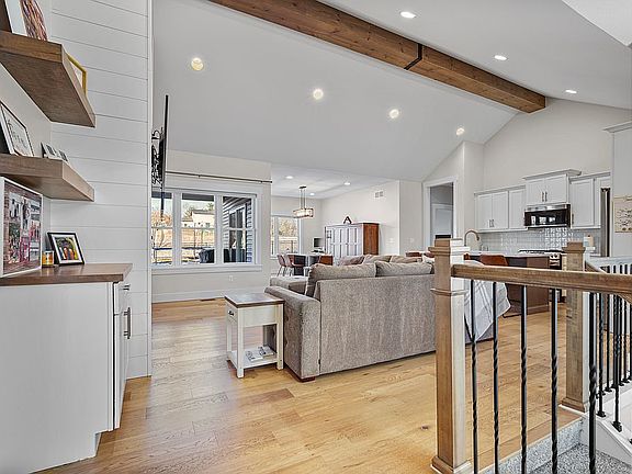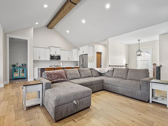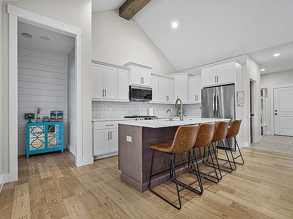 Step inside to a bright, airy main level featuring beam-vaulted ceilings in the great room, kitchen, and primary suite, along with 9-foot ceilings throughout the rest of the main floor. The custom kitchen includes quartz countertops, a stylish tile backsplash, stainless steel appliances, and a generous walk-in pantry, perfect for cooking and gathering.