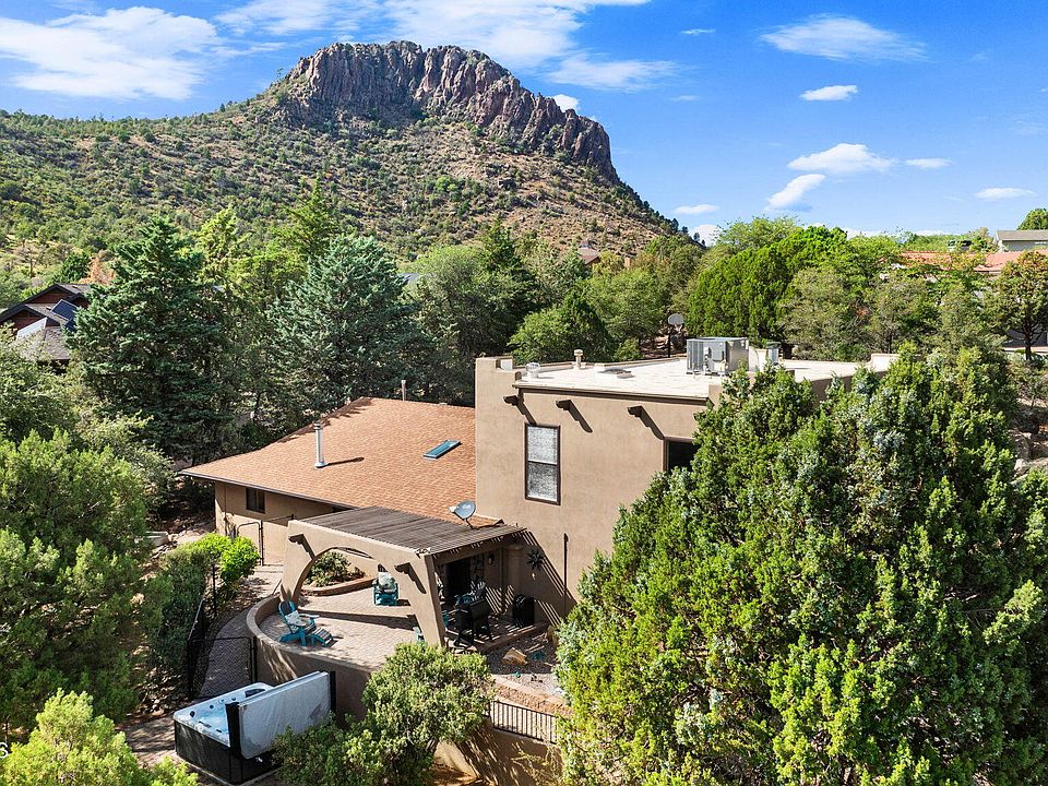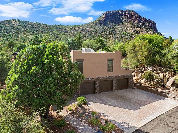 Quality, privacy and cool Sante Fe style in a solid-built stucco home on .44 fenced acres of pure nature with dramatic boulders, lush landscaping and a Thumb Butte backdrop in a classic Prescott neighborhood with a 3 car garage and no HOA. Over $350k in upgrades! A paver courtyard with pergola, custom gate and artistic rock water feature overlooks a large fenced yard with eight-person spa and deluxe 60 x 60 inch heated dog house. A handcrafted Anasazi front door invites you into open concept living with a huge living room with vaulted beamed ceiling, upscale rustic and hand-scraped hickory floors that flows seamlessly to the kitchen and dining areas. The chef's kitchen features six burner Thermador professional range, showstopper prep island with a top harvested from an old barn and coated with glass, custom knotty alder cabinets, granite counter tops, LG Instaview French door fridge and coffee/wine station with drink fridge. Main level has one of two primary suites with stylish tile shower and a third bedroom or office. A luxurious primary is up a short flight and has a private deck looking right at Thumb Butte and an expansive fenced yard, a beehive fireplace, walk-in closet and bathroom with soaking tub and walk-in shower. Extra deep three car garage with storage galore. Just 10 minutes from Courthouse Square's shops, restaurants, bars and special events, Dignity Health medical center, Yavapai College, Prescott College, VA campus, public and charter schools, and National Forest trails for hiking and biking. Very rare opportunity to capture the real Prescott lifestyle. Over $350k in upgrades include:HVAC system up and downstairsAlder doors and trim throughoutCustom wood stairs to primary suiteNew bath in main level primaryInsulation blown throughoutNavien Tankless hot water heater systemLifetime energy-efficient windows throughoutMarvin Infinity slider in primary suiteAll windows individually sealed Skylights sealed throughoutHunter Douglas remote-controlled window shades throughout Carpet in downstairs bedrooms and primary suiteFresh exterior paintStucco refreshedCustom handrail to upstairs suiteCustom courtyard gateCustom front doorPaver drivewayFencingHeated 60'' x 60'' dog house Masterspa Twilight SpaPergola roof off front door3 new garage doors with high capacity springsEpoxy garage floorRetaining wall and French drain system added to back of home to ensure proper drainageExtensive landscapingWooden decorative design beamsKitchenAid commercial microwaveKitchenAid dishwasherAvallon wine fridgeFresh interior neutral color paint New roof coating above primary suiteWooden bar island coated in glassRock water fountain in front courtyard