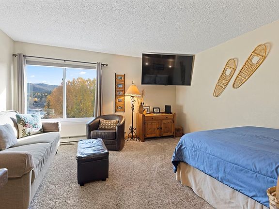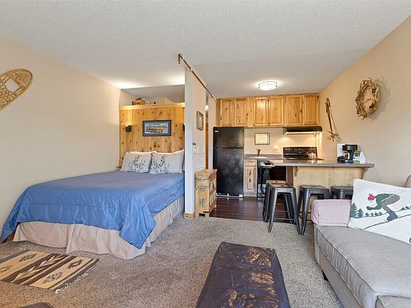The residence features an efficient, open-concept layout with a remodeled full kitchen including a dishwasher, full-size range, and refrigerator. The updated full bathroom is spacious, and multiple storage options allow plenty of room for your mountain accessories. The living and sleeping area enjoys natural light and overlooks Main Street, the Blue River, and Baldy Mountain.
