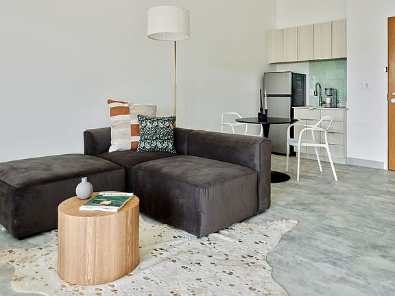 All of the Tomorrow Building apartments come fully-furnished with sophisticated, modern furniture. Utility Package includes: Water, electric, sewer, high-speed internet in your apartment, on-site parking, and complimentary community events. We offer 12-month lease terms for this location. As a resident, you have access to a stylish community lounge with a fully-equipped kitchen, high-end TV, and cozy seating for you to enjoy.