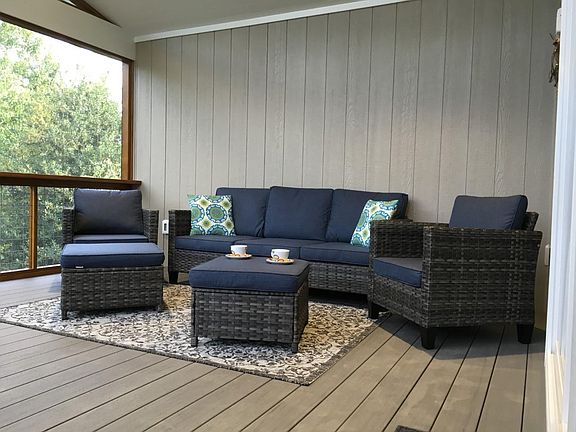 Sleek quartz countertopsBali black-out shadesLeather sleeper sofaFull-sized washer and dryerScreened and covered porchVinyl plank flooringModern kitchen appliances