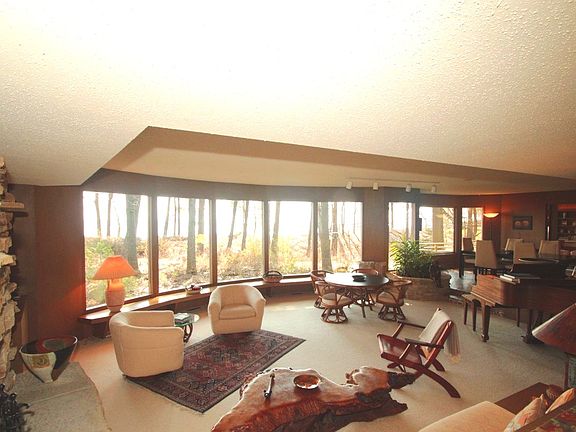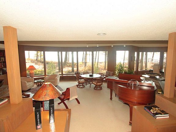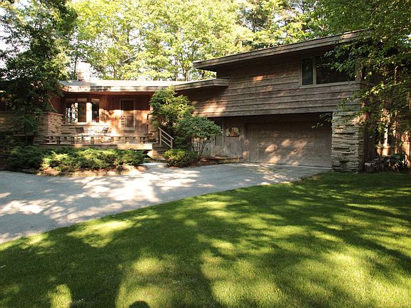 A Frank Lloyd Wright inspired prairie style design. Exceptional building materials: pecky cypress, limestone, cedar decking, mosaic tiling & stunning mahogany wood. Low maintenance home w/ abundant storage, private master suite, 1st floor laundry, 2 natural stone fireplaces & unique built-ins. Be charmed w/ the impressive functional flow, both inside and out, as you gaze onto a private beach on lake Michigan w/ 118'of frontage. Custom design & generous sized rooms make it great for entertaining. A sunny eastern exposure with a multitude of windows highlights the quality craftsmanship within.