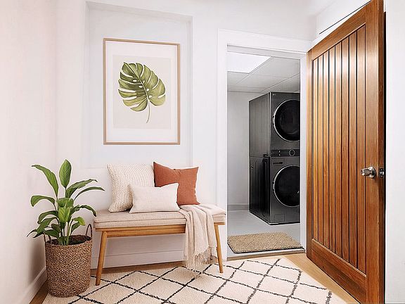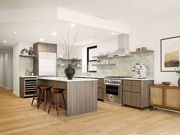 The versatile open layout accommodates multiple configurations, including a dedicated dining wing and home office. The windowed, open kitchen with custom Porcelanosa cabinetry boasts top-of-the line appliances, including a Liebherr refrigerator with dual freezers, a 5-burner Bertazzoni oven, and an Avanti wine cooler. A generous quartz center island with overhang offers additional counter space, seating for 3 and storage. A separate laundry room with with LG washer and dryer is adjacent to the kitchen.