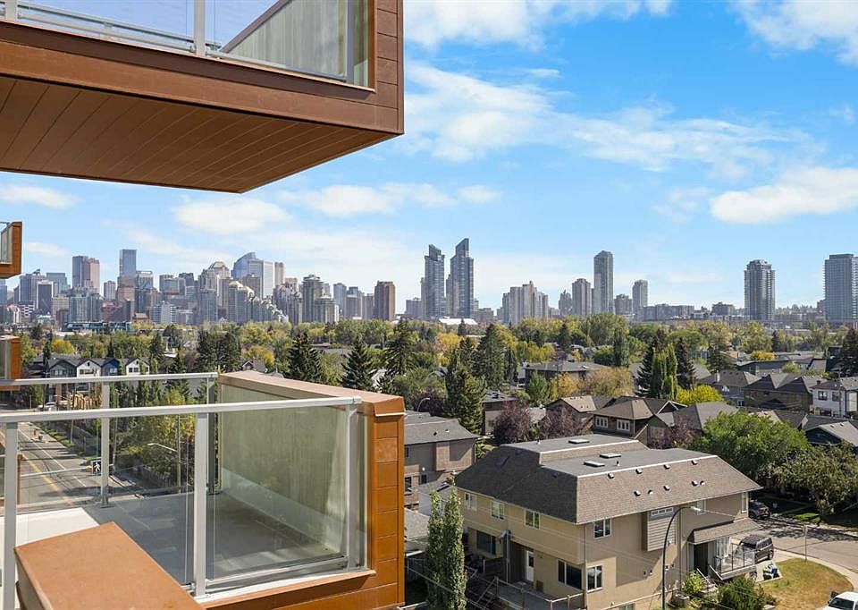 Experience modern city living at Frontier by Truman Homes, a boutique concrete residence in West Hillhurst, just steps from the vibrant Kensington district. This 6th Floor Corner Unit offers 410 sq.ft. of smartly designed 1 Bedroom, 1 Bathroom living, with Floor-to-Ceiling Windows that fill the space with natural light and frame striking downtown views from the South-facing Balcony. The open-concept layout features Vinyl Plank Flooring throughout, a combined Living & Dining area, and a contemporary Kitchen with Quartz Countertops, Stainless Steel Appliances, and a Gas stove. The South-facing Balcony provides a bright and airy outdoor extension of your Living Space, perfect for enjoying city views. The Primary Bedroom is comfortable and well-lit with ample closet space. A modern 4-Piece Bathroom includes a Quartz Vanity, and in-suite Laundry adds convenience to everyday living. This unit also comes with a titled underground Heated Parking and an assigned storage for your convenience. Residents also enjoy thoughtfully designed amenities including a fully equipped Fitness Centre, co-working lounge, pet spa, landscaped second-floor terrace, and on-site retail such as FreshCo, C+C Coffee, Crave Cupcakes, Metro Liquor, and more. With Kensington’s boutique shops, cafés, acclaimed restaurants, and scenic Bow River pathways just steps away, plus quick access to Downtown Calgary and the LRT, this unit offers a perfect blend of city living, style, and convenience. Its corner location, upscale finishes, and smart design make it an excellent choice for both living and investing.