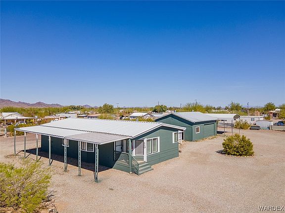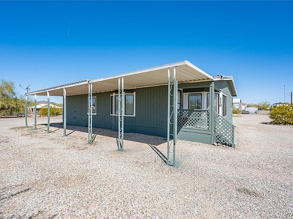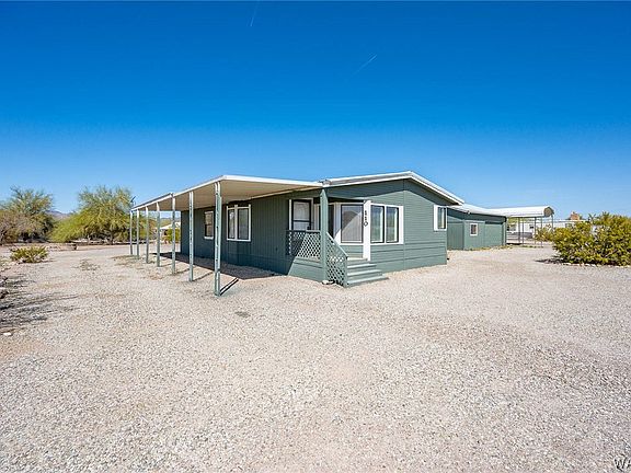 Discover this peaceful 2-bedroom, 2-bathroom home with a bonus office in Quartzsite, Arizona. Enjoy energy-efficient double pane windows, a sturdy metal roof, and modern HVAC system for year-round comfort. Seller is offering a $5,000 flooring allowance to potential buyers. The property features a spacious carport, a 32-foot deep 3-car garage with a finished room, and a large attached porch for relaxation. Two 50-amp RV sites, a storage shed, and a 12x40x12.5 Kool Kover provide additional space and shade. The fenced and gated property offers privacy and security, while an unconnected well presents potential for future use. Seize the opportunity to make this serene desert property your own.