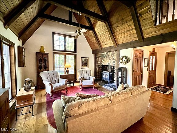 Live your Country English Cottage dream! Once in a storybook lifetime opportunity to own this spectacular home in Valley City. Beautifully designed to fulfill your dreams of country living close to all amenities. This spacious 3-4 bedroom, 2 full bath  cottage on 2 acres includes an oversized 2+ car detached garage (672sqft) with a walk-up second floor heated work shop (flex space). The home is loaded with cottage charm, including a beautifully detailed cathedral ceiling with wood beams and a stone wood burning fireplace igniting only your imagination. The main entrance greets with a beautiful stone elevation and a solid wood entry door. Floors are solid hardwood. The first floor includes a back mudroom entry that leads to a home office. 2 flex rooms on the first floor can be interchangeably used as bedrooms, den. The second floor includes 2 large bedroom spaces and one full bathroom. The basement level is a full foundation crawl space approx 4' high (great storage and access). A spacious wood deck extends the charm of the home, overlooking a spacious yard with mature trees and large shed. Recent updates and upgrades: Roof and gutters 2021; HVAC 2012, Basement cistern holding tanks 2025.  The property is set among other beautiful country homes. Lovingly maintained!