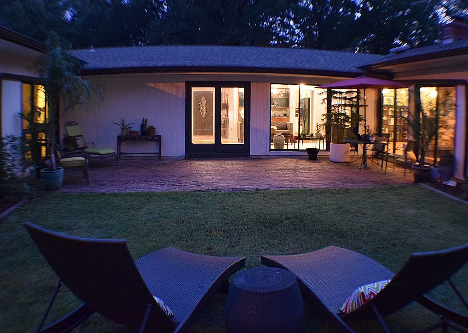 A beautiful and unusual mid century modern home, currently painted in it's original striking color, ideally located in the highly desirable Pidgeon Estates neighborhood and White Station School District. This home has been tastefully modernized while retaining many of the original mid century features, including beech built in cabinets and expansive windows looking into the central courtyard. Fitted kitchen with cabinets by Kitchen Craft, granite counters, gas stove, double oven and all appliances. Two bathrooms, the huge master has a whirlpool tub, shower and two wash basins, this may be the most striking master bathroom you've ever seen! The second bathroom nicely refinished in a clean contemporary style. The floor plan gives three separate living areas, a double sided fireplace, a media room and a bonus storage room. The three bedrooms all have built in closets, plus an additional large walk in closet in the master. The attached double garage also has additional storage areas. This house is much larger than it looks, and well worth your time to take a visit, it is not the traditional Memphis home! Call the motivated property owner for a viewing, the number is all the way at the bottom of the page...