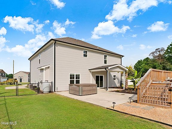 Outdoor amenities include a covered back patio, a 2023 above-ground saltwater pool with salt cell replaced last year and a deck built in 2024, plus a hot tub purchased in 2022. Pool and hot tub are maintained regularly by Carolina Pool and Patio (Goldsboro).