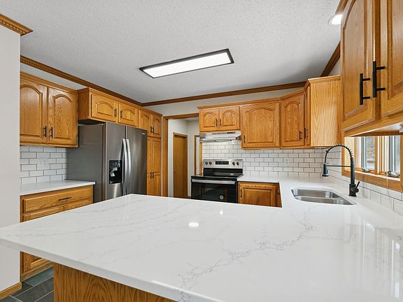 This newly remodeled 5-bedroom, 4-bathroom rambler, built in 1993, offers modern updates, quality craftsmanship, and views of wetlands and open country. Situated on a desirable corner lot with a fully fenced yard, this home features durable metal siding, Anderson windows, and a whole-home backup generator for added peace of mind. Inside, the spacious main level boasts a bright living room with a cozy gas fireplace, elegant 6-panel doors, and a convenient main-floor laundry room. The updated kitchen shines with oak cabinetry, granite countertops, slate flooring, a stylish tile backsplash, and stainless steel appliances. Freshly painted with new carpet throughout, this home is truly move-in ready. The lower level offers a huge family room, perfect for entertaining or relaxing. A heated and insulated garage adds extra comfort year-round. Don't miss this beautifully updated home in a peaceful setting--schedule your showing today!