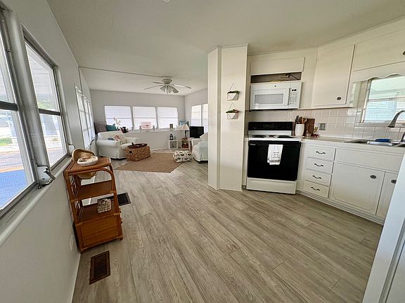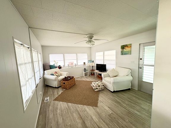 This home is a perfect Florida retreat! Make it your own for a vacation home, seasonal living, or investment for rental property. 1 bedroom, 1 bath, partially furnished home with vinyl plank floors throughout. Very large private backyard and close to the back gate leading to the Pinellas Trail. Carport is extra long to accommodate two cars with storage shed. Interior has been newly painted, light and bright! Kitchen has white cabinets and laminate countertops. Full bath off hallway offers tub/shower, white cabinet with laminate countertops and large upper storage for linens. Large Florida room with washer/dryer and lots of windows with newly painted floors and is ready to be turned into an extra bedroom, living room, office. This home has a neutral pallet is waiting for a new owner to finish the upgrades that were recently started. Home received a passing 4-point inspection in April 2025. Roof and HVAC are approx 5 years old. This mobile home is a Tropicaire model and they are extremely solid and known for having "good bones." Honeymoon Park is one of the most sought after 55+ mobile home parks in Dunedin, Fl. Low lot rent of $643 includes pass through tax, lawn care and garbage (Increasing to $675 beginning Jan 1, 2026). Honeymoon Park backs up to the famous Pinellas Trail making walking and biking effortless. Also enjoy the convenience of nearby shopping, restaurants, marinas, historic downtown Dunedin, and Palm Harbor. Florida's best beaches are minutes away, including the Gulf at Honeymoon Island/Dunedin Causeway and Clearwater. The All Florida Mobile Home Sales Inc. cannot guarantee or warrant the accuracy of this information or condition of this property. The buyer assumes full responsibility for obtaining all current rates of lot rent, fees, and pass-on costs. Additionally, the buyer is responsible for obtaining all rules, regulations, pet policies, etc., associated with the community, park, or home from the community/park manager. All Florida Mobile Home Sales Inc is not responsible for quoting of said fees or policies.