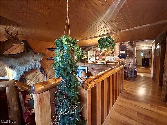 Cozy cabin-like feelClassic brick exteriorAbove ground poolLarge storage buildingWood accentsSerene atmosphereWarm tones