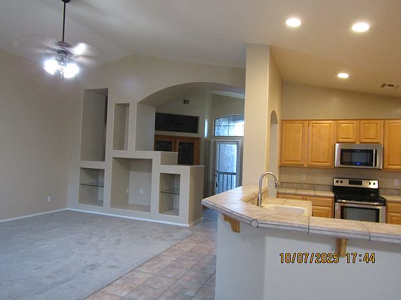 Single story 3 bedroom with enclosed den 2 bath home with all new paint and carpets. Vaulted ceilings meet you at the entrance with large living area with built ins, tons of kitchen counter space and breakfast bar. Split floor plan allows private space for the primary bedroom with all windows having summer screens for privacy and keeping home cool during our summer months. Front yard is easy to maintain and backyard has grass area for play. Garage has built in cabinets for extra storage.