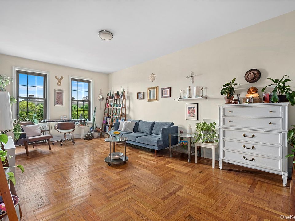 The generous living room and king-sized bedroom are framed by oversized landmark windows that look west across the Concourse to the Andrew Freedman Home. The newly installed, historically accurate windows are not only beautiful but also energy efficient and exceptionally quiet, creating a peaceful retreat above the tree-lined boulevard. Evenings bring extraordinary skies and dramatic sunsets.