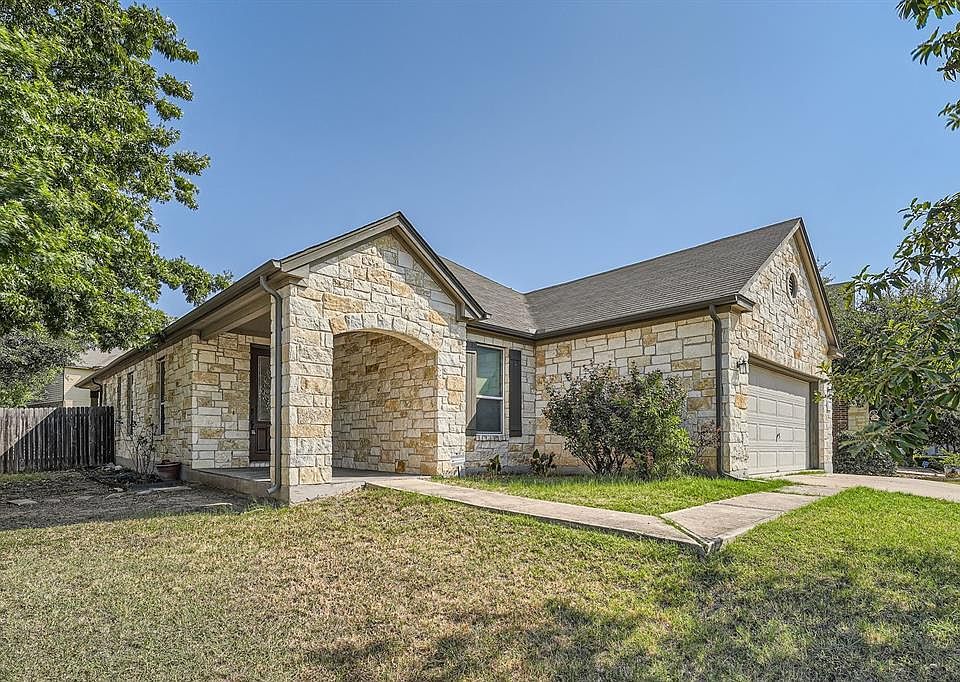 Charming French country-style single-story home on a spacious corner lot in the desirable Ryan's Crossing neighborhood! This beautifully maintained 3-bedroom, 2-bath home features elegant stone siding, a welcoming front entrance, and a two-car garage with a wide driveway. Step inside to find an open floor plan with light marble-finish flooring, an inviting living space, and a stylish kitchen complete with dark stone countertops, decorative backsplash, stainless steel appliances, a center island, and eye-catching light fixtures. Perfect for a young family or couple with pets, the fully fenced backyard offers privacy, room to play, and space to entertain. Located just minutes from Old Settlers Park, Dell Diamond, Kalahari Resort, and major shopping like H-E-B. Zoned to Round Rock ISD, this pet-friendly community also features parks, trails, and a relaxed suburban vibe. Whether you're enjoying a quiet evening at home or exploring all that Round Rock has to offer, 1100 Hyde Park Dr is a perfect fit for modern living