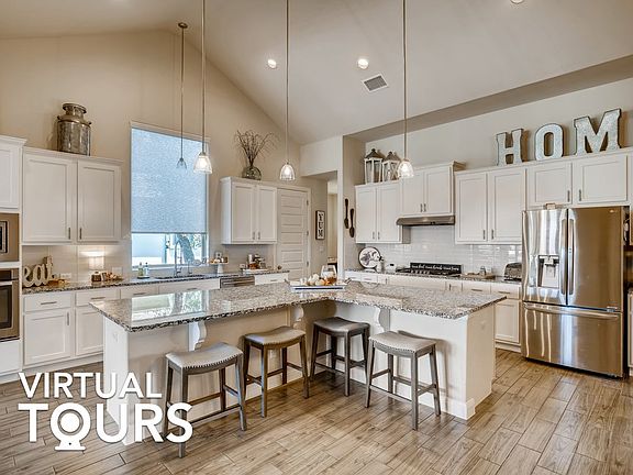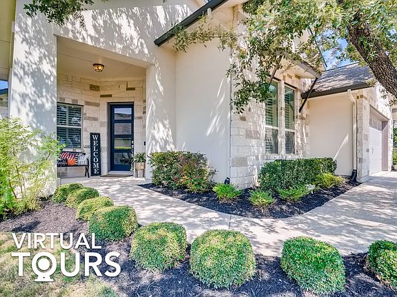 Can't-miss 3 bd/ 2.5 ba with great open floor plan and wonderful sunsets in quiet Georgetown community! After entering, you're welcomed into a beautiful wood-look tile interior, which leads to a brilliant, open concept first floor. You'll find the modern kitchen, which boasts granite countertops, stainless steel appliances, pendant lighting, and a huge center island. The dining area sits next to the kitchen, perfect for hosting guests and includes a lovely high, vaulted ceiling. Head to the living area to sit and unwind; it features a beautiful fireplace and recessed lighting for a mellow ambiance, and has beautiful views. Every window throughout the house has a plantation shutter or an electric, remote controlled shade installed. The primary bedroom features beautiful flooring and estate-style shutters, and includes an unbelievable ensuite bathroom with a huge dual sink vanity and massive tile shower. The remaining bedrooms are well-sized with estate shutters and good natural light, perfect for guests or a home office. Out the back doors, you have a personal oasis -- the covered patio overlooks the central Texas nature, and the built-in barbecue and wet bar make this space an entertainer's dream. Nearby: Lake Georgetown, Cimarron Hills Country Club, San Gabriel River, local shopping and dining, easy access to I-35 and a short commute to downtown Austin. Buyer to verify all information.