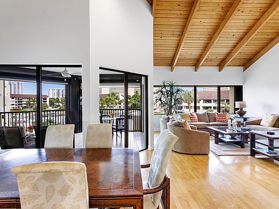 Stunning views from every room of this 4 bedroom 3 full bath condo end unit with loft. Also INCLUDED YOUR OWN PROTECTED BOAT SLIP IN HARBOR VILLAGE PRIVATE MARINA. 1 1/2 miles to Palm Beach Inlet. NO FIXED BRIDGES. Beautifully wood vaulted ceilings. Buildings up to date with all Florida building codes. No Special Assessments. Screened porch with electric hurricane shutters. Assigned parking with separate 6'x8' storage. Pool with hot tube. 2 mile walking path along the water. 27/7 manned security gate. Belle's restaurant on premises.