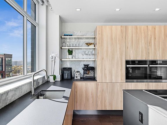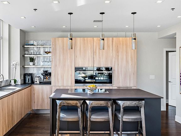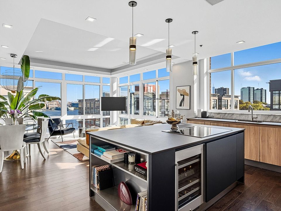 Stunningly designed 2 bed/2 bath corner Penthouse with southeast NYC & Hudson River views, right here in the luxury waterfront community of 1100 Maxwell Ln. This one-of-a-kind home was described as “chic but cozy” when featured in DesignNJ. The kitchen (designed by Mimi&Hill) is appointed with Arclinea cabinets, Dekton countertops, and Carrera marble backsplash, as well as Miele appliances including an induction cooktop, downdraft exhaust, 2 wall ovens (conventional and steam), a SubZero refrigerator and Gaggenau dual zone wine cooler. Raised ceiling heights in the kitchen and living areas accentuate the open feel created by the floor-to-ceiling windows, and the bespoke built-in dining banquette with a Moooi chandelier truly makes this living space complete. The oversized primary bedroom is soundproofed with a walk-in closet and ensuite bath with double vanity. The second bedroom is spacious with NYC/river views. Custom closets and hall pantry, automated window treatments, gleaming hardwood floors, and deeded parking spot #69 round out this perfect home. The community’s luxury amenities include 24/7 concierge and security, 2 gyms, 2 pools, 2 playrooms, 2 rooftop decks with BBQ grills, community rooms, and shuttle service to and from the Path. The building is conveniently located near the NYC Ferry, bus stop, shops, restaurants, and everything that uptown Hoboken has to offer.
