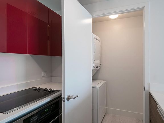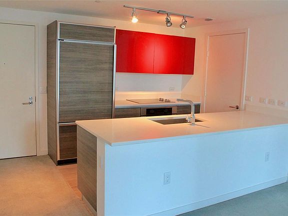 The apartment features top-of-the-line appliances, an open kitchen with Italian cabinetry, imported stone countertops, a washer and dryer in-unit, walk-in closets, a nice balcony, and one parking space included.