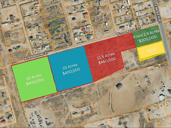 Over 34 acres of land available in West Odessa! Great location! Easy access to I-20! Can be commercial or residential! Seller can sell property all together (around 34 acres) or in 10 acre portions and 2.5 front portion separately.