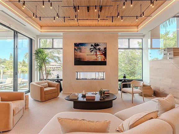 Winner of the 2025 Sand Dollar award for Product Design of the Year for Single Family. Welcome to a visionary newly built 2025 contemporary trophy where Architectural Art Meets Waterfront Living. At 1100 Sandpiper design, nature, outdoor living, and technology converge in to timeless elegance. Just one mile from iconic 5th Avenue South and 1.8 miles from the Gulf Beaches, this modern waterfront marvel fuses bold architectural artistry with effortless indoor-outdoor living. With nearly 200 feet of direct Oyster Bay corner frontage, a 60-foot dock already in place (with room for more), and a sculptural form that commands attention from every angle, this is Naples’ ultimate statement home. Rooted in the five natural elements: water, air, earth, fire, and stone -the residence exists in perfect harmony with its environment. Water shimmers from every perspective. Bright light and air drifts through vast glass walls and open terraces. Earth blooms in the lush rooftop lawn and tropical gardens. Fire glows through eight fireplaces across the home. Over 7,500 square feet of natural stone, including 40+ full marble slabs, anchors the structure in enduring sophistication. Outdoor living rivals the interior with nearly equal finished square footage: fully screened waterfront lounges, sunrise and sunset terraces, and secluded open-air zones. The newly completed 1,500-square-foot rooftop sanctuary - complete with sunrise and sunset lounges framed by glass railings—creates a sky-level retreat beyond compare. Inside, nearly 4,000 square feet under air offer five bedrooms, five full baths and two custom half baths. Dual maste suites: one on each level - serve as spa-like havens with luxurious en suites and double vanities as well as a steam shower. 1500 square-foot wraparound terrace seamlessly merges the main living space with the outdoors. Nicknamed The Modern Taj Mahal designed by reendowed Stoff Cooney, this home’s gallery-like glass architecture and structural integrity are unmatched. Built with solid stainless-steel engineered commercial flood panels, it stands among Naples’ most resilient and forward-thinking waterfront builds. Sustainability and innovation shine through a high-output solar roof system with Tesla Powerwalls, a 30+ speaker high-fidelity audio network, and eight fireplaces, including a dramatic centerpiece framing the 12×14 hot tub. The grounds evoke a private resort—three poolside fire bowls, six sculptural water features, and 25+ rare exotic palms illuminated by 100+ warm custom landscape lights. This is far more than a luxury residence: it’s a living masterpiece where art, nature, and modern engineering coexist in perfect balance. Quite simply, Naples’ most visionary home with unprecedented levels of modern luxury & technology in every detail.