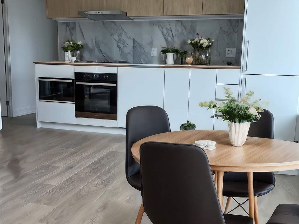 Floor-to-ceiling windowsLaminate floorsModern kitchen