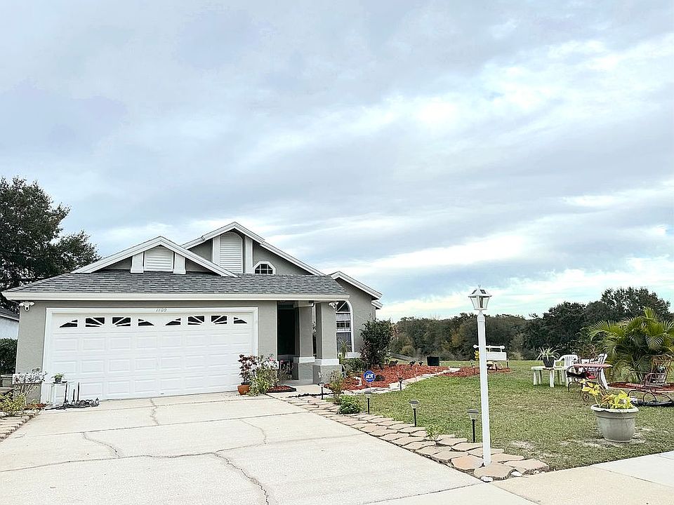 A beautiful home with scenic lakefront view and tranquil and peaceful atmosphere. Freshly painted, new roof, new air conditioning, new plumbing, new flooring,, new doors, new appliances, new water heater, new septic tank field, new insulation, camera security system, new lighting, remodeled kitchen, bathroom vanity, cathedral ceiling with open spacious floor plan, fireplace, and two car garage. Second owner home. Quiet community with lovely view for walking and biking as well as playing tennis or swimming. Neighborhood close to great schools, major shopping centers, theme parks, turnpike, I-4, 408. Neighborhood pool, tennis court, playground, security.