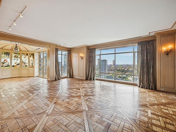 Sumptuously finished home purposed for refined daily living and elegant entertaining. High-design features include stunning Versailles-pattern & wide-plank hardwood floors; elaborate bespoke ceilings; trompe l’oeil stained glass panels; rich paneled or upholstered walls; art lighting; sleek cabinetry; pocket doors; select marble and granite surfaces. Open living areas surrounded by full-length windows, wide balconies, wonderful tree-top views. Inviting dining rm w/ silver/china closet. Distinguished chef’s kitchen/gathering space w/ full-sized SubZero ref & frzr, Thermador ovens, extensive storage/service area. Breakfast rm. Superb full bar w/ 2 chillers, 2 beverage drawers. Secluded primary suite w/ expansive sitting rm w/ book/display shelves, full length windows; private balcony; remote-controlled sun shades; lavish marble-clad & mirrored bath w/ designer wallpaper, separate sink decks, vanity; double walk-in closet. Luxurious guest suite w/ upholstered walls, marble-clad bath.